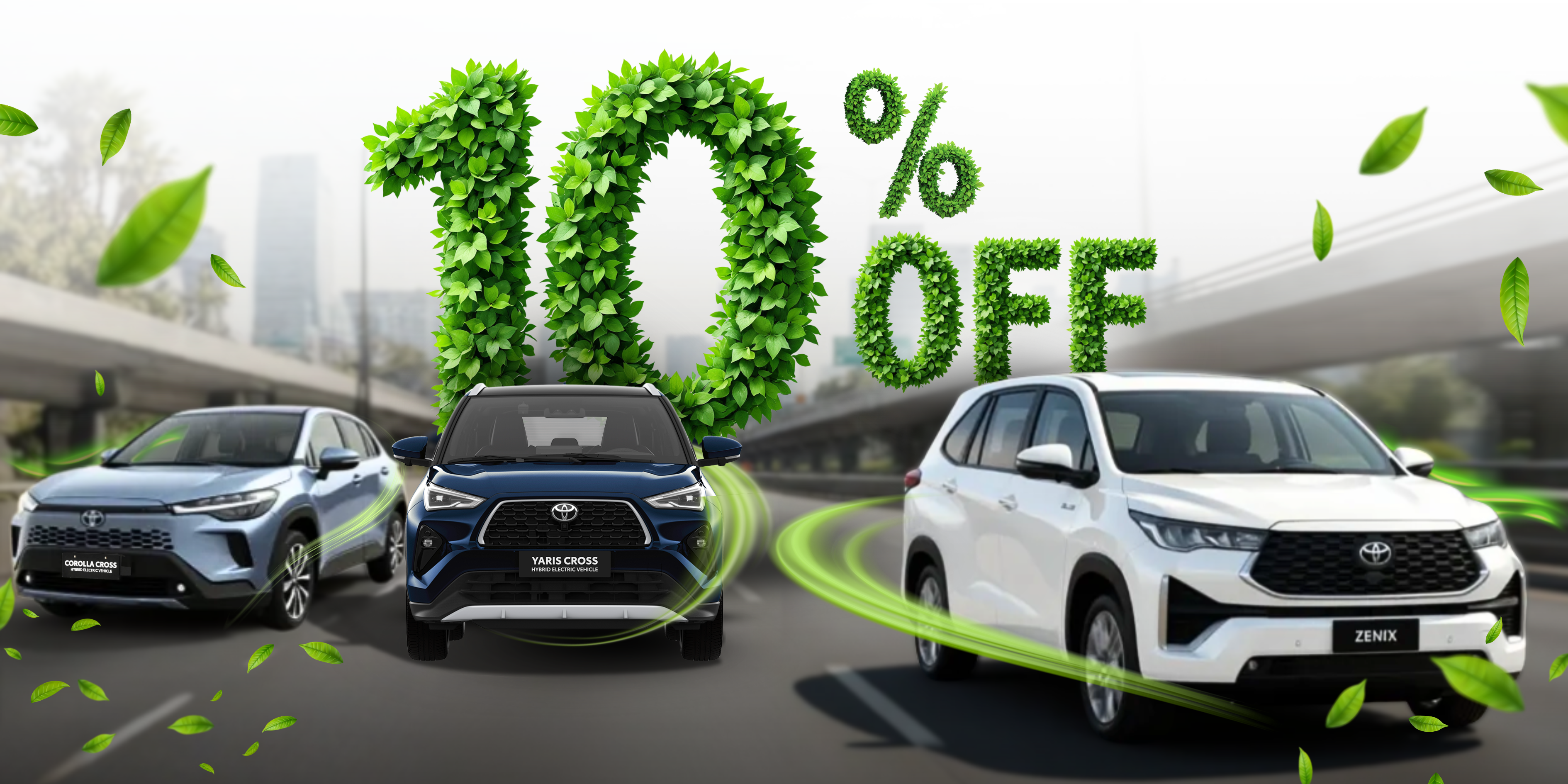 Make your next trip smarter and more sustainable! Enjoy 10% OFF when you rent any of our Toyota Hybrid models — Corolla Cross, Yaris Cross, Zenix, or Camry.